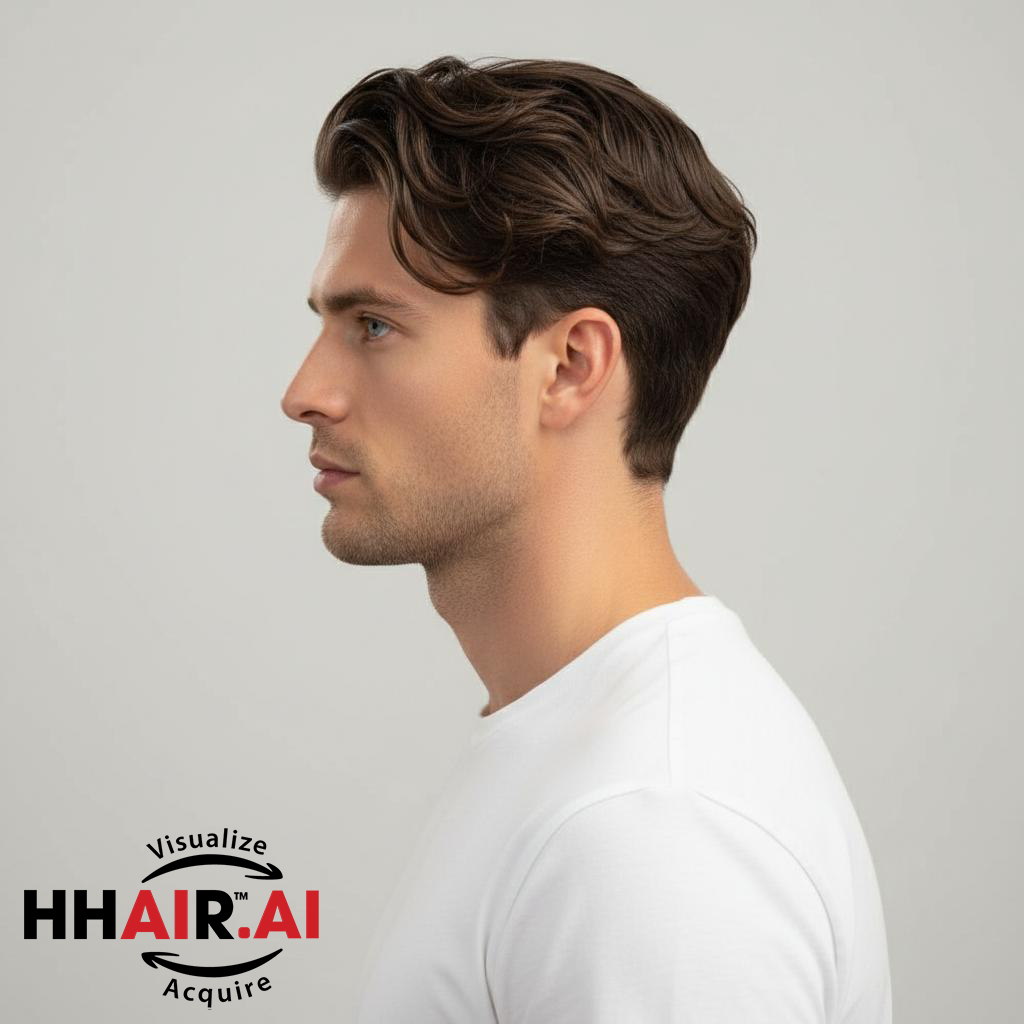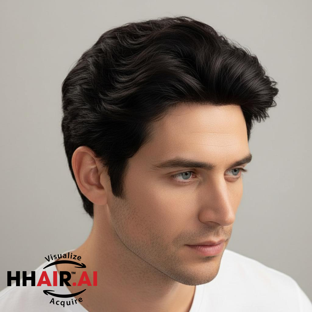 | Wigs Name | Men’s Top Hair System – 3D Ultra-Thin Skin, Layered Wispy Bangs, Dark Brown |