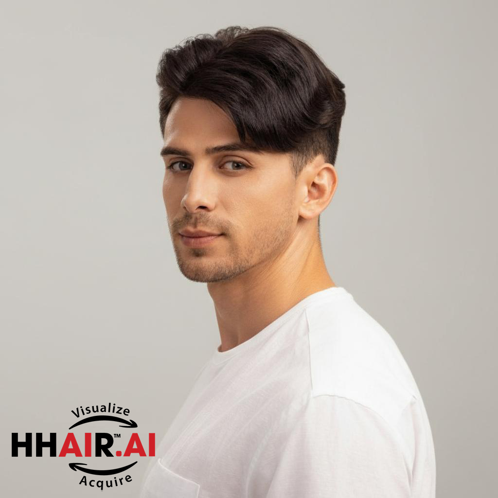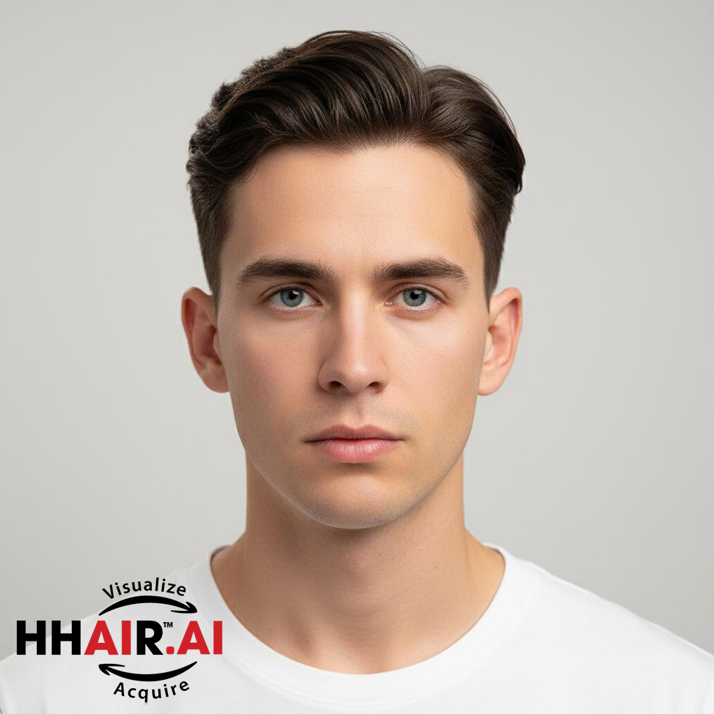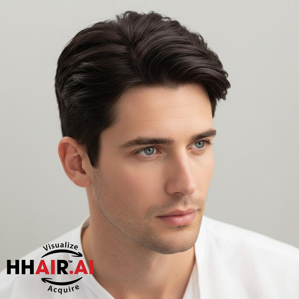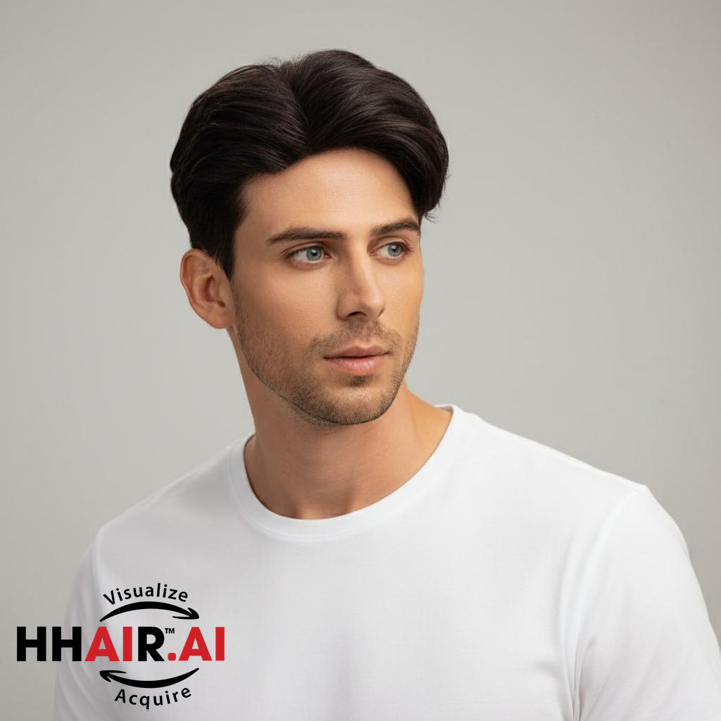 | Wigs Name | Men’s Top Hair System – 3D Ultra-Thin Skin, Side Part Slicked Down, Dark Brown |